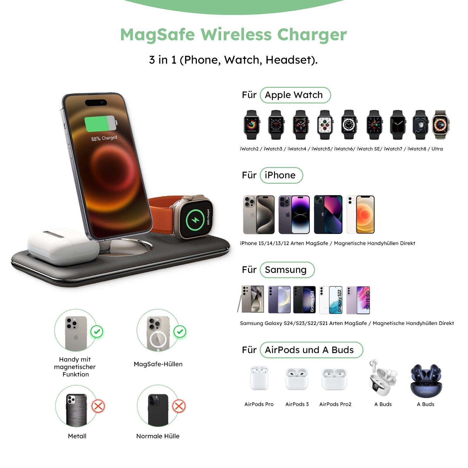 Hast du genug von Kabelchaos und überladenen Steckdosen? Mit der Alkaya 3-in-1 Ladestation in elegantem Schwarz gehören diese Probleme der Vergangenheit an! Sie ermöglicht Ihnen das gleichzeitige Laden Ihres Smartphones, Ihrer Smartwatch und Ihrer kabellosen Kopfhörer – effizient, schnell und völlig kabellos.