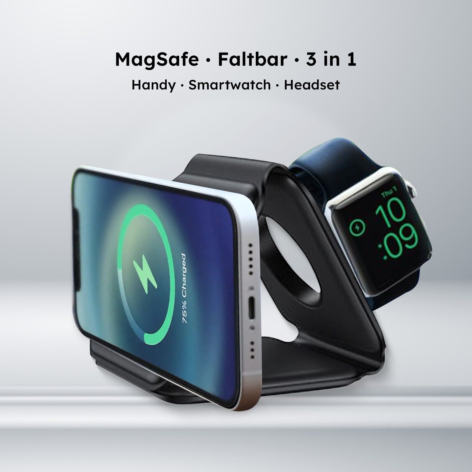 - Funktion: 3-in-1-Ladegerät für Smartphone, Smartwatch und Kopfhörer